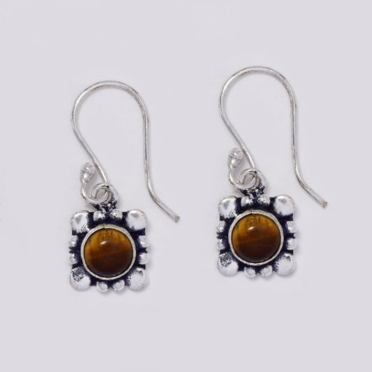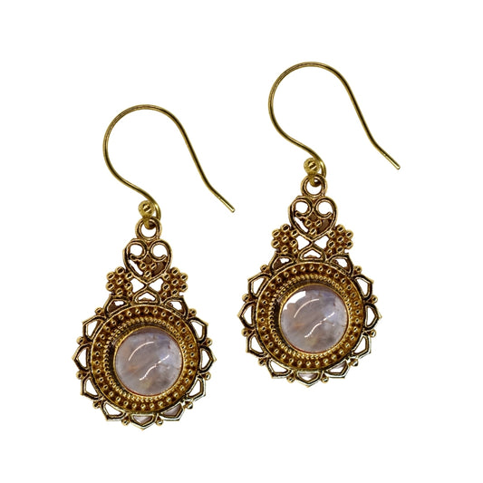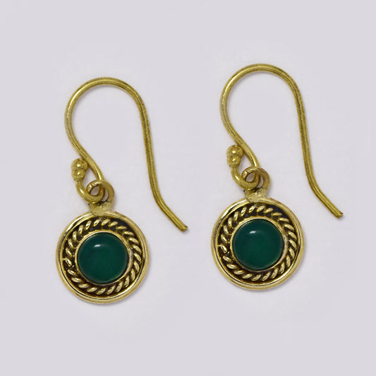 Brass hook drop earrings with round gemstone on geometric design - IFE718