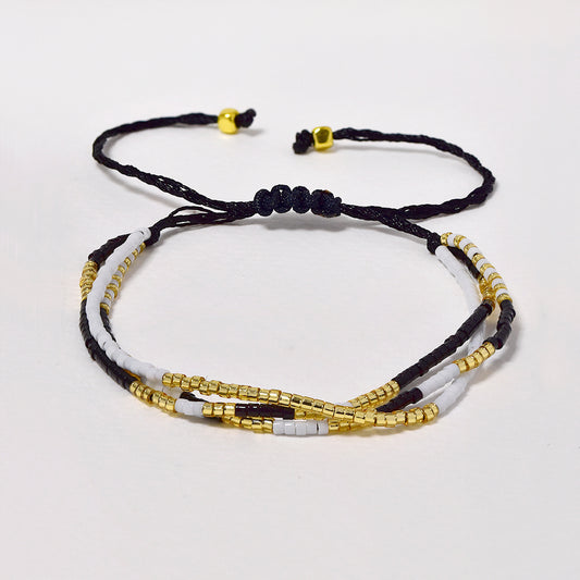 Fashion adjustable black cotton white and gold beaded bracelet - MFB3021