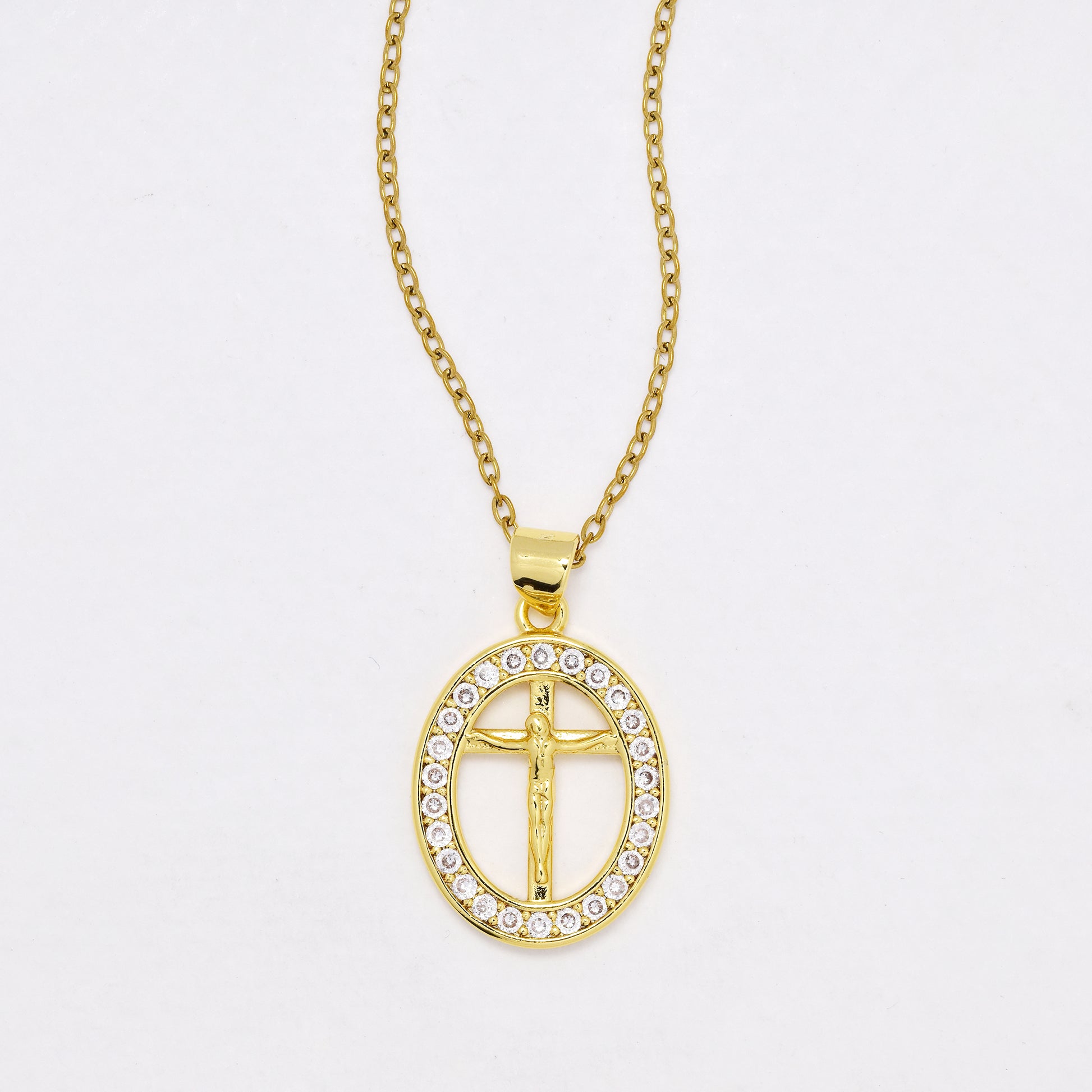 CZYN6402 - S Steel 41cm + 5cm oval CZ and cutout cross necklace