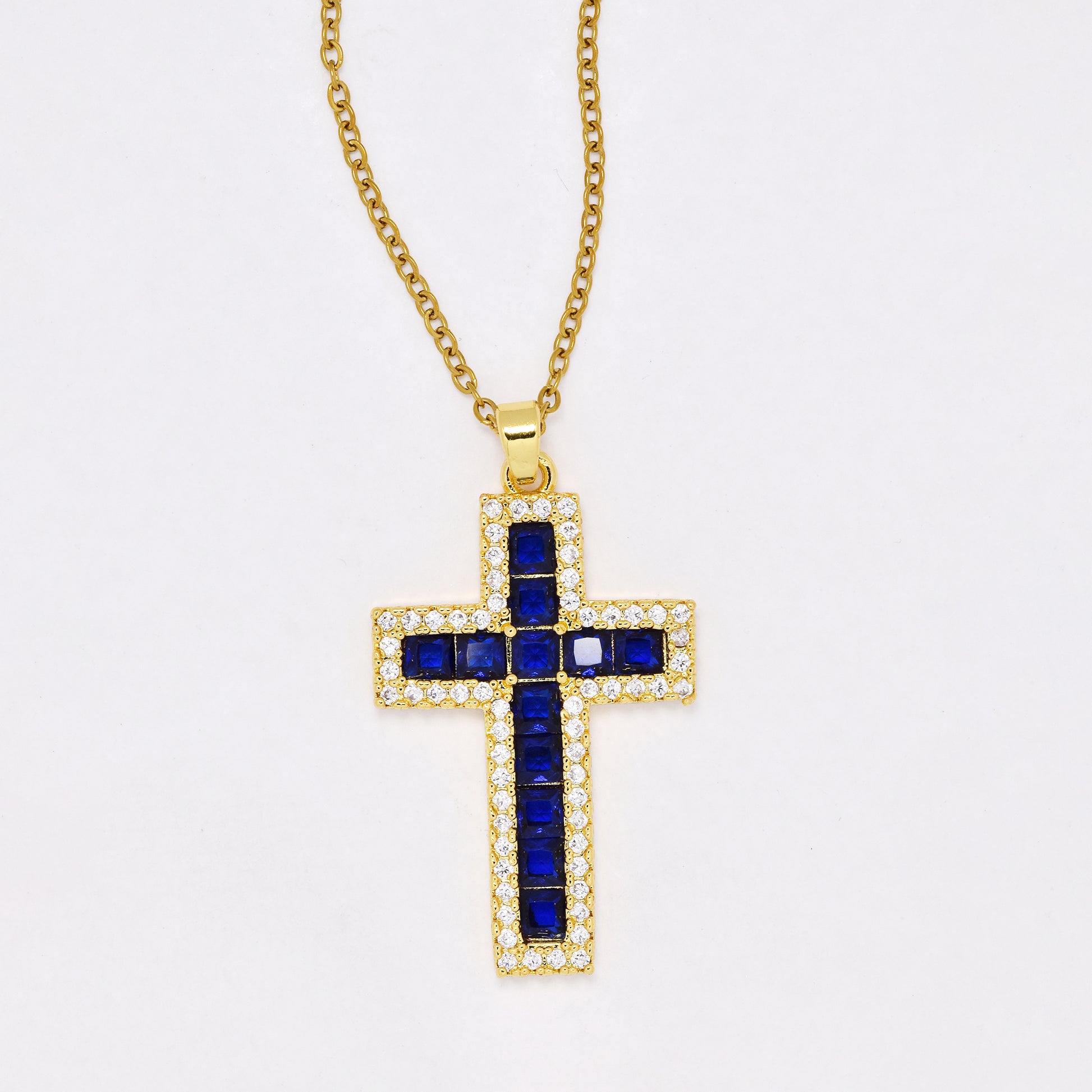 CZYN6406 - S Steel 40.5cm + 5cm blue and clear CZ cross necklace