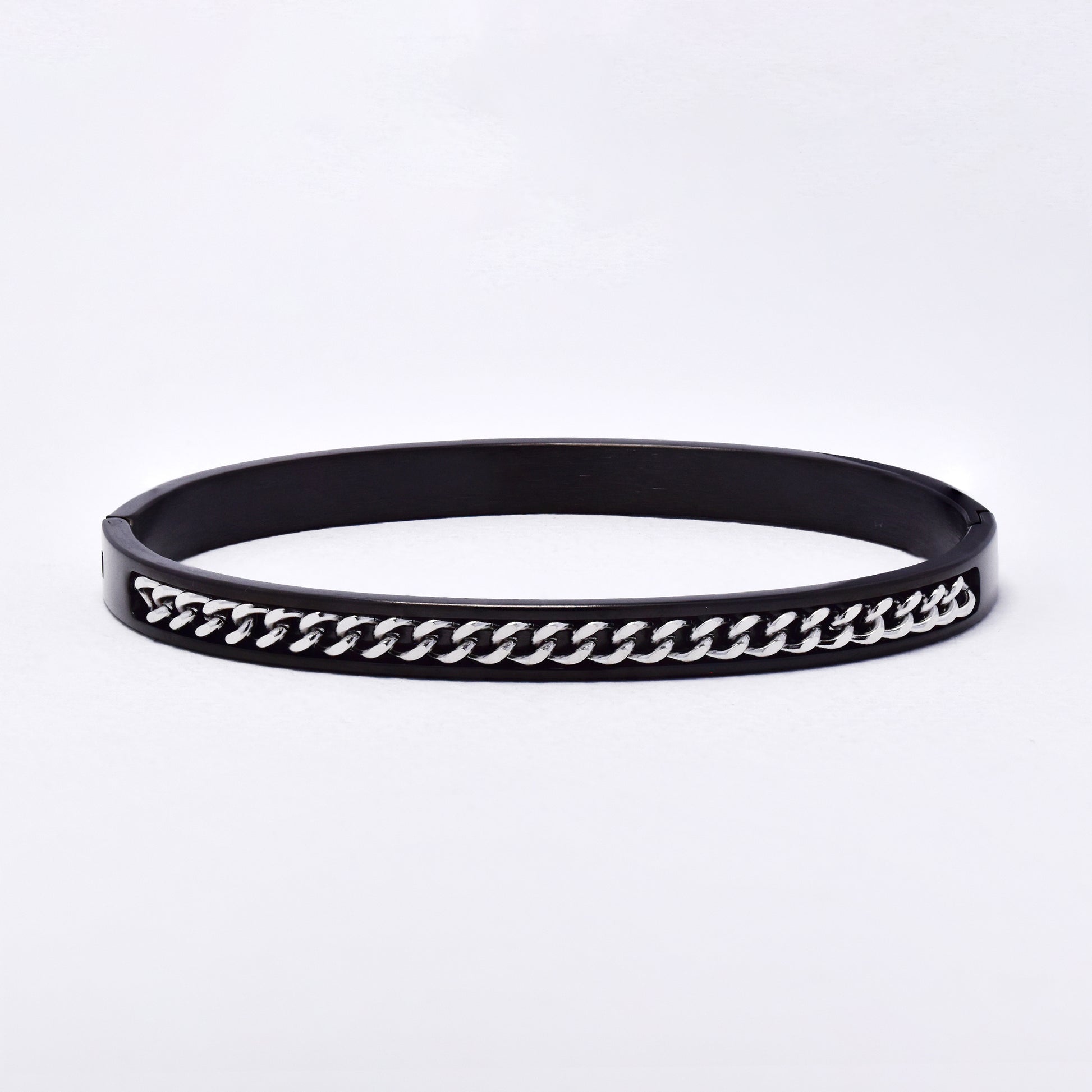 SSYB6287-SBLK - St Steel 69mm x 57mm x 6mm hinged bangle with chain detail