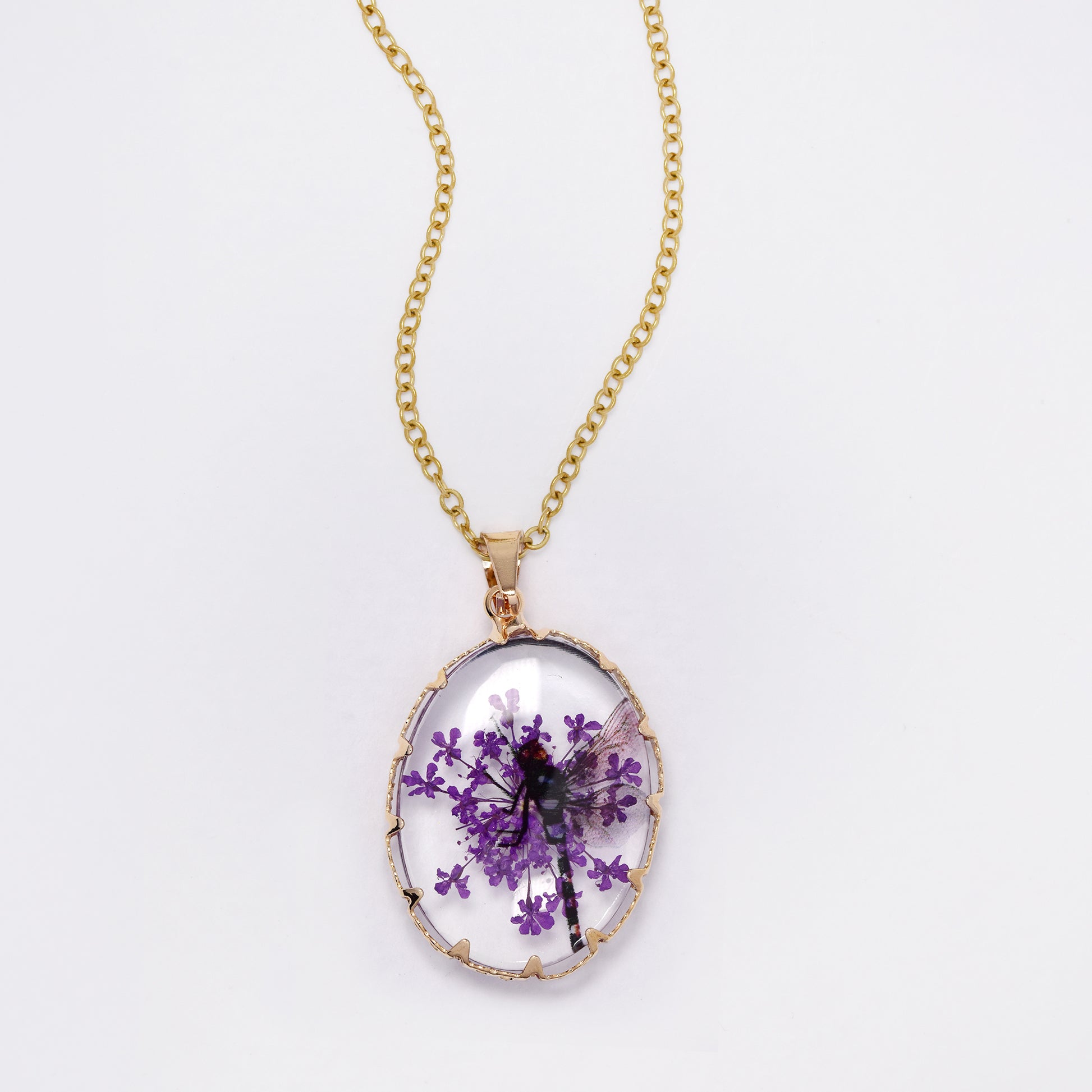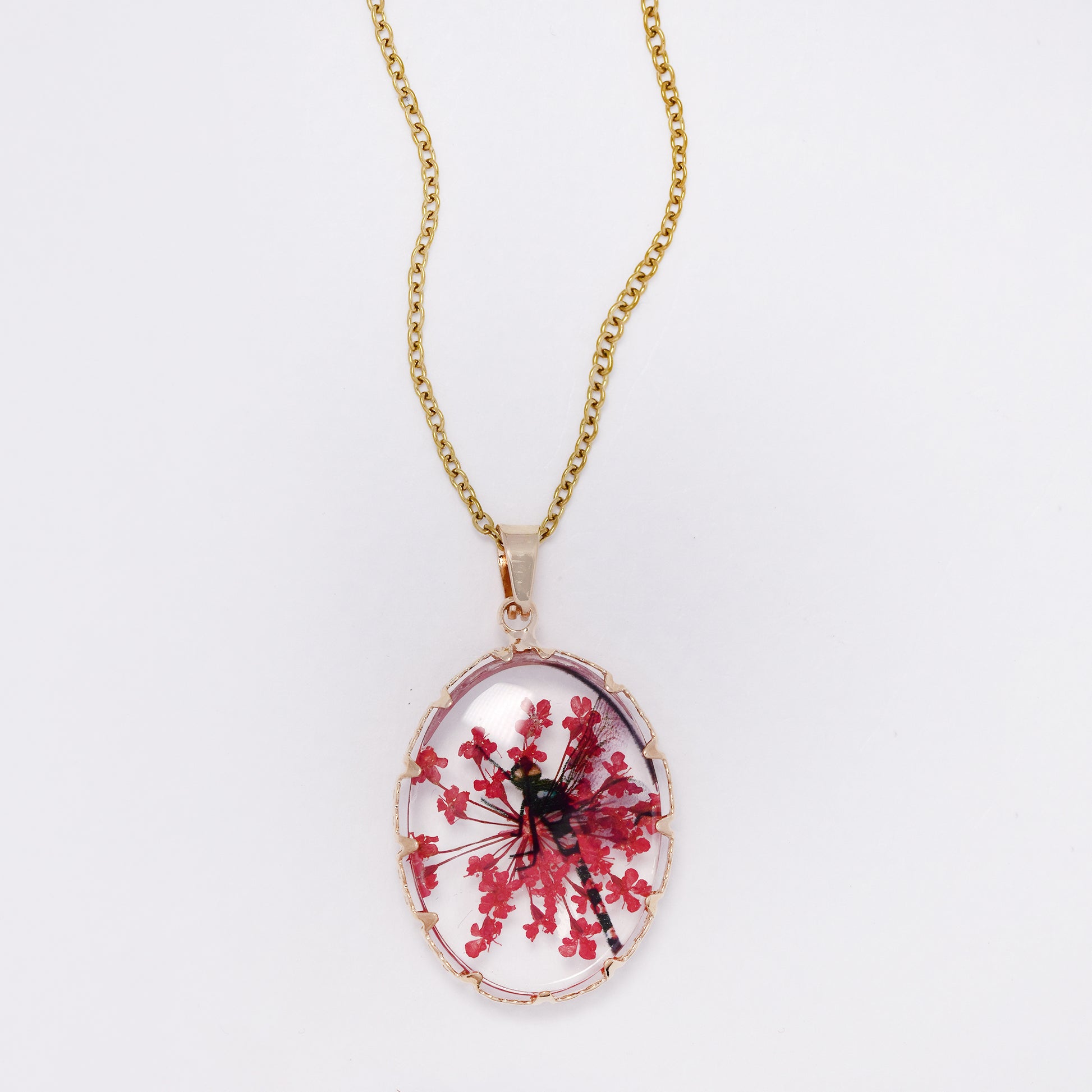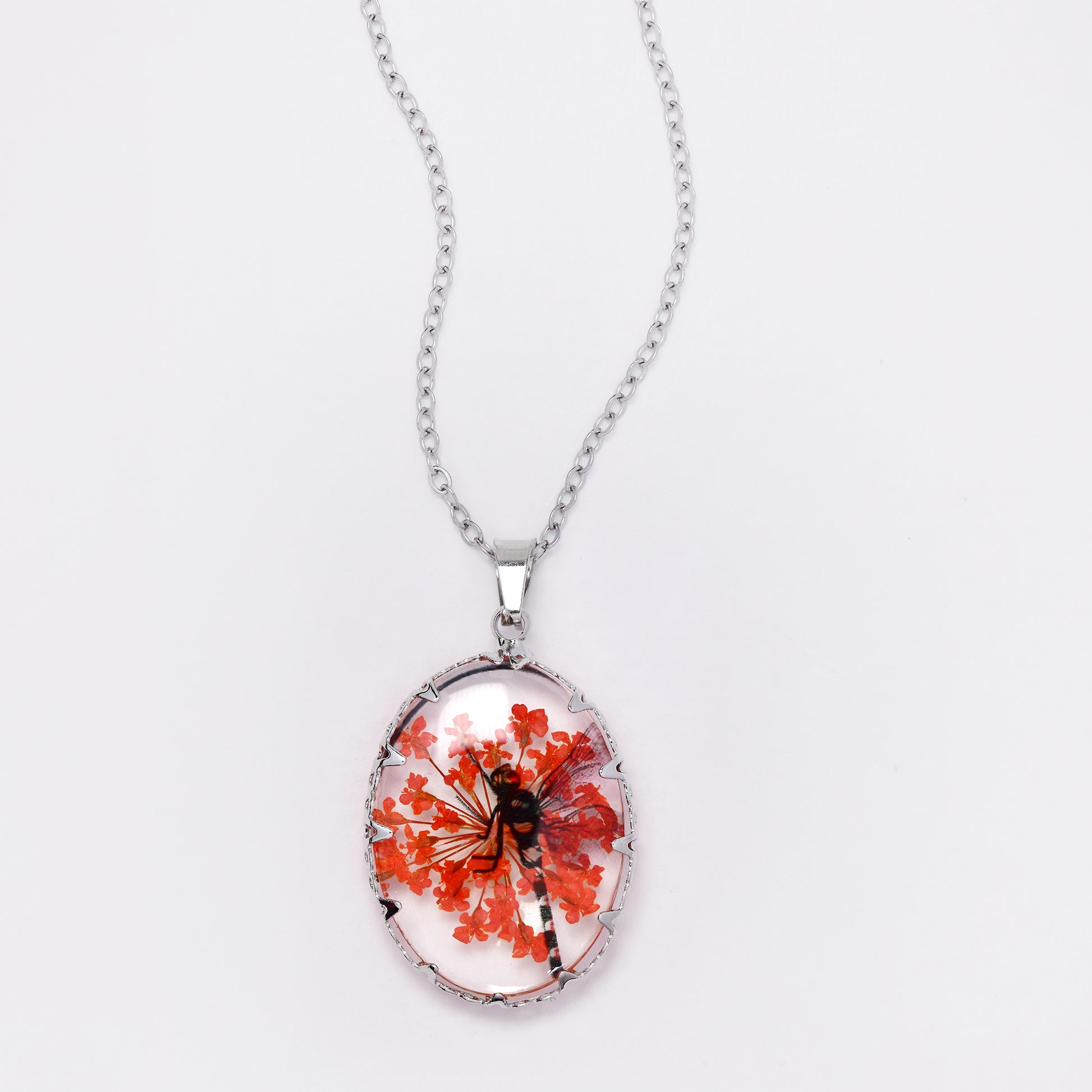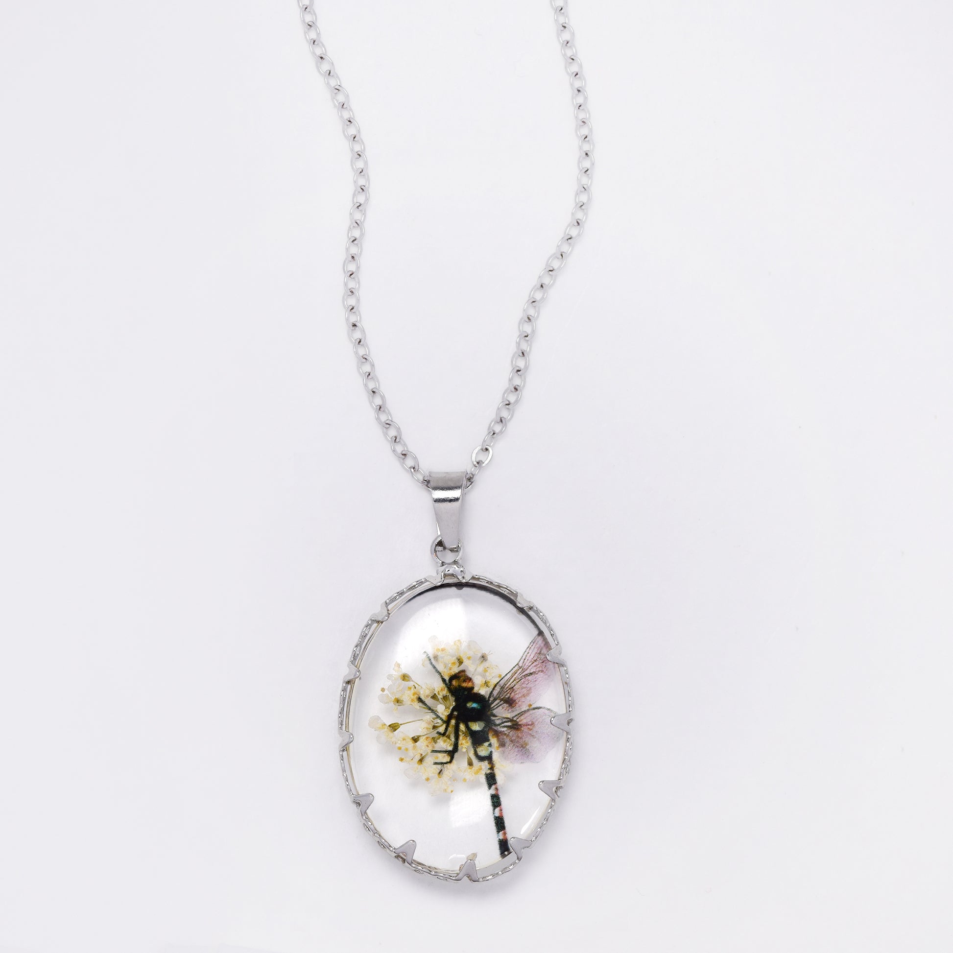 SSYN7450 - Steel 40cm + 5cm oval dragonfly floral resin necklace