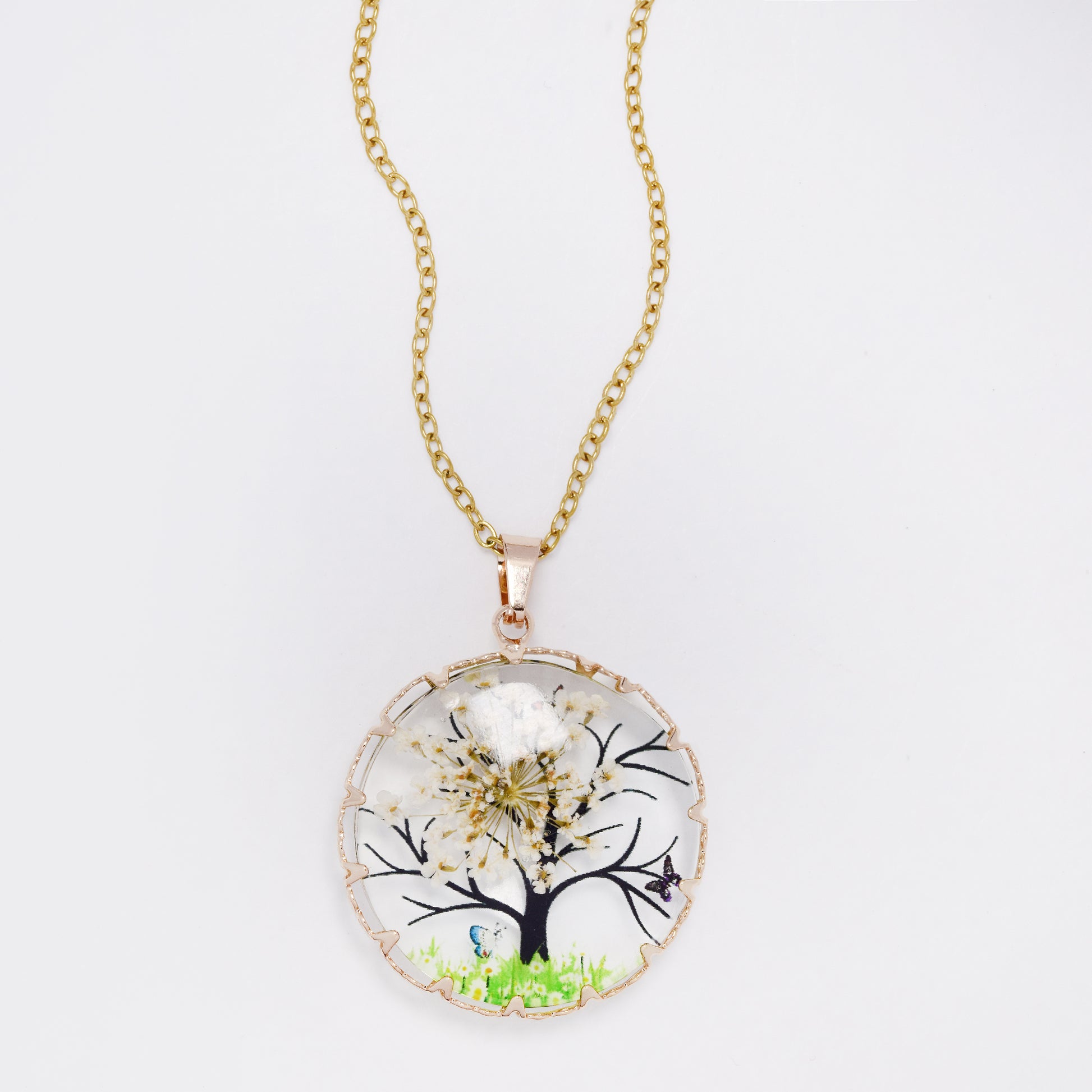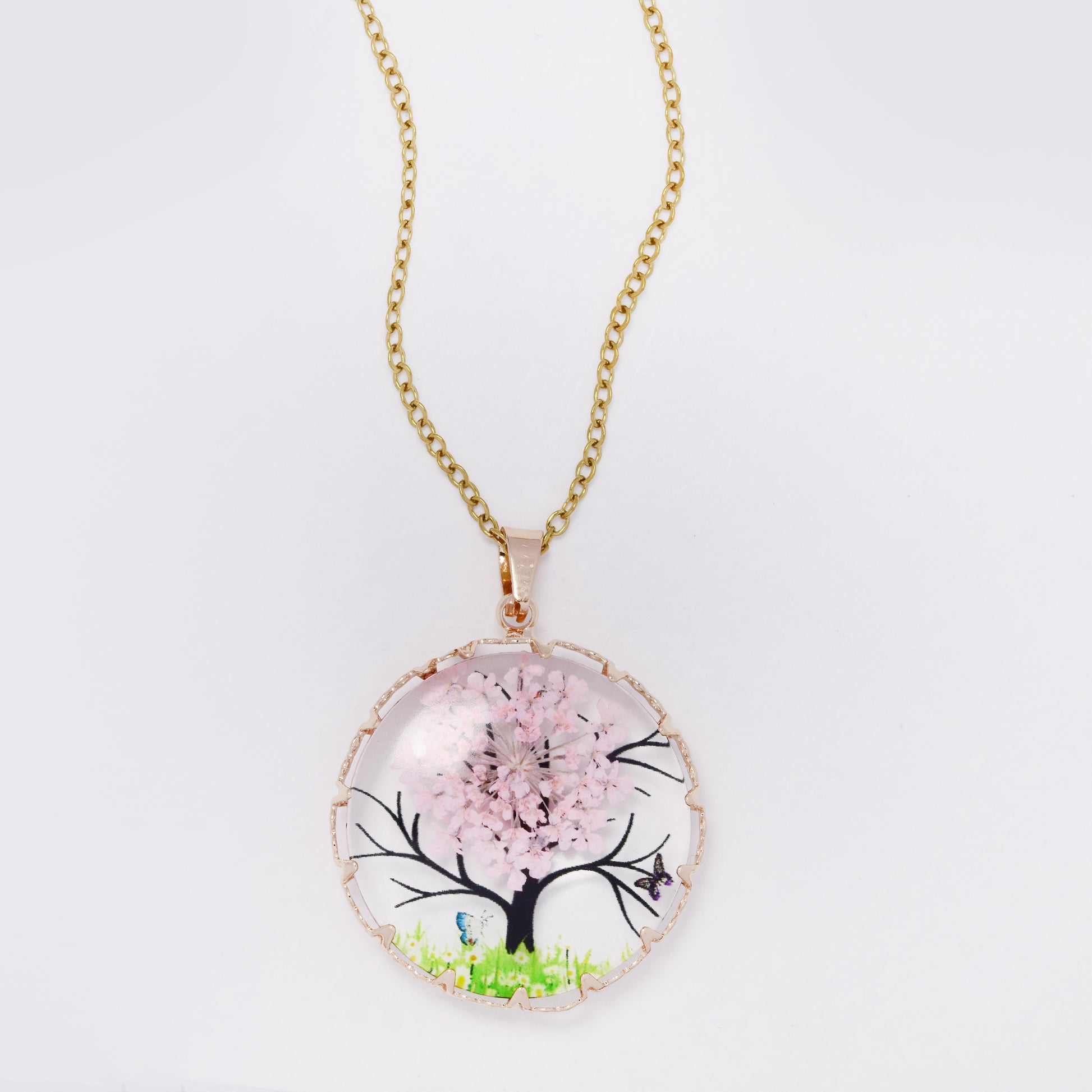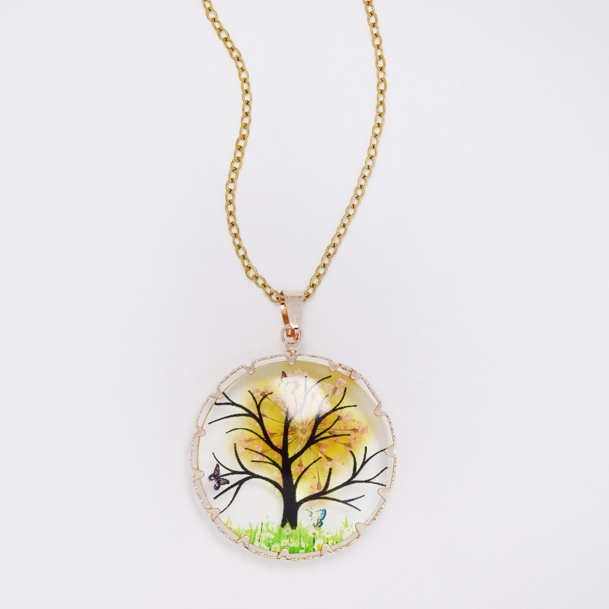 SSYN7451 - Steel 40cm + 5cm round tree & butterfly resin necklace