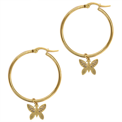 2 Pack Stainless steel gold 35mm hoop with 10mm x 12mm butterfly charm earring - SSYE3086